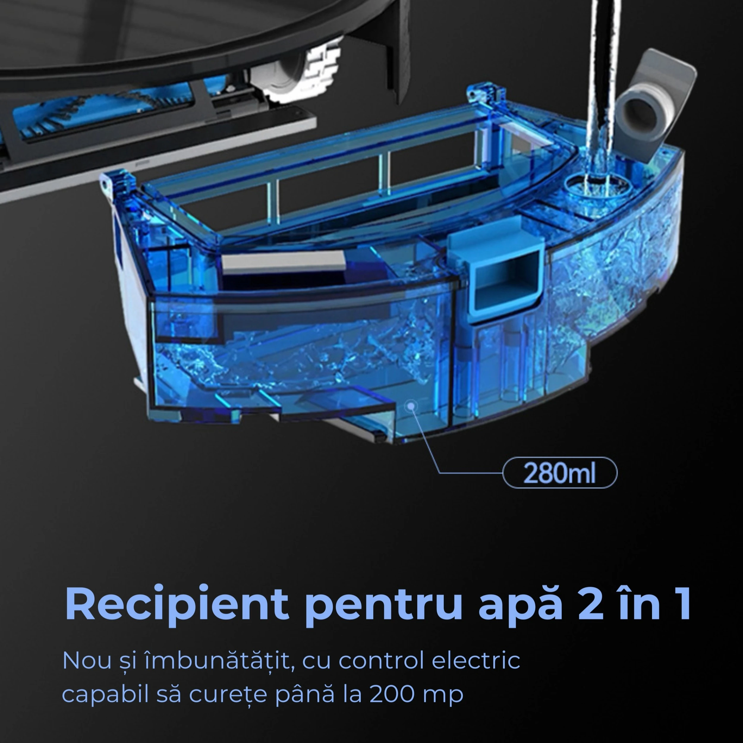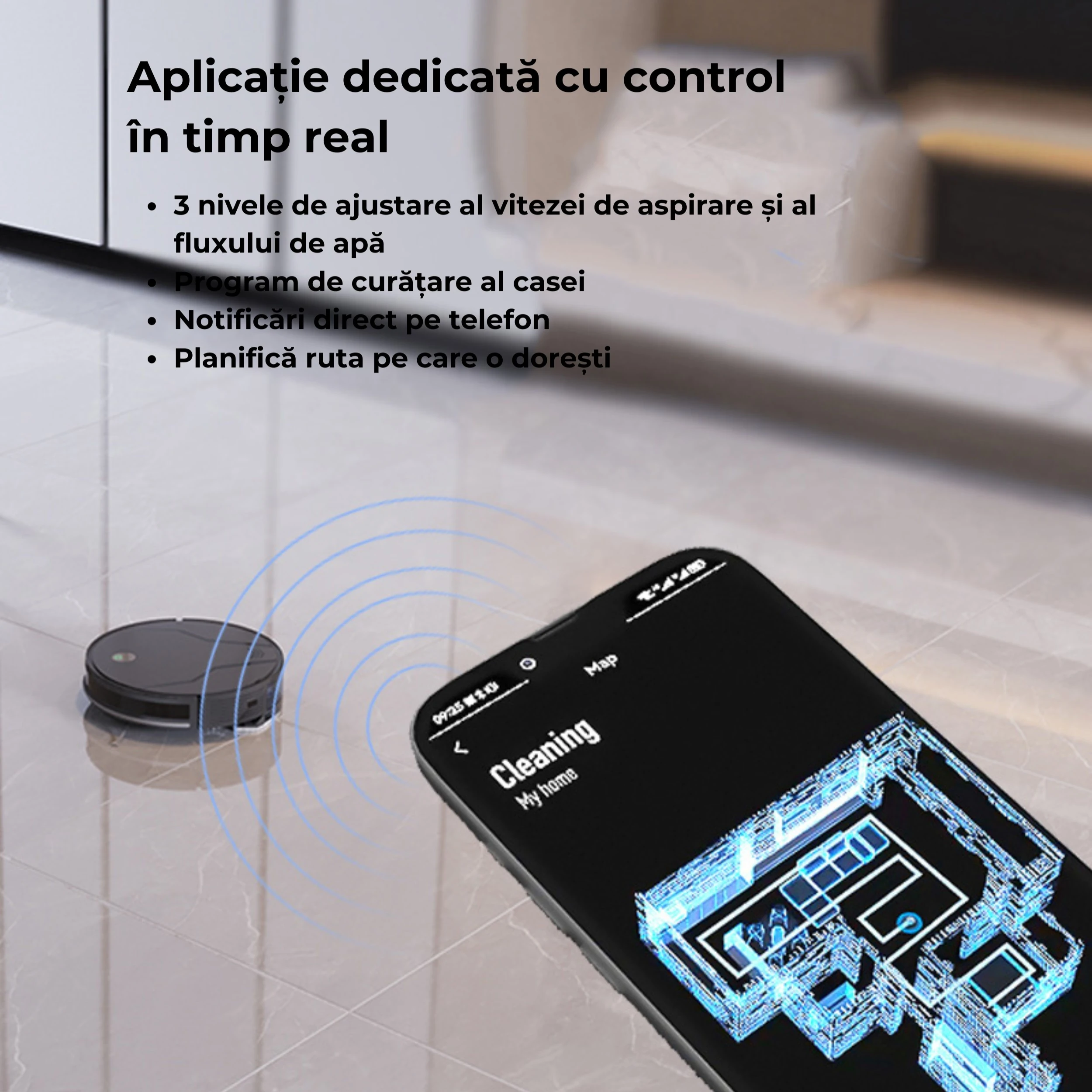 Acest aspirator robot combina doua functii esentiale: aspirarea uscata, care aduna praful, mizeria si resturile, si curatarea umeda, care spala si elimina petele de pe podele. Este ideal pentru gospodariile care au nevoie de o solutie completa de curatare. Poti sa alternezi intre modul de aspirare si cel de mop automat, economisind timp si efort in procesul de curatare zilnica.