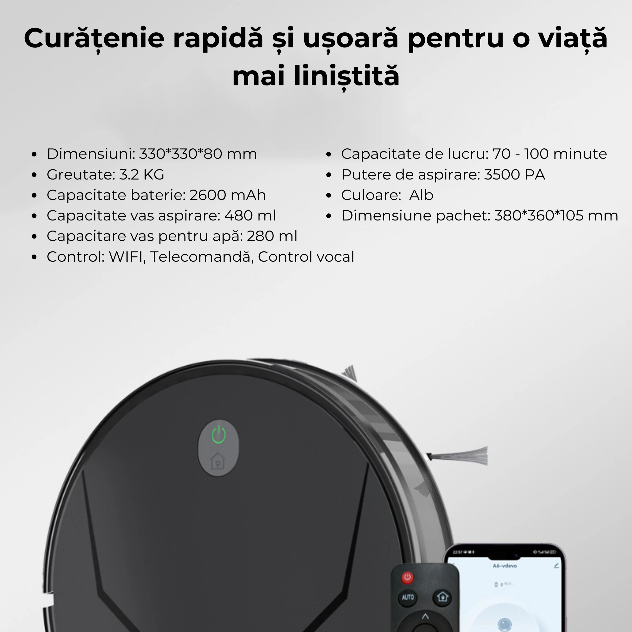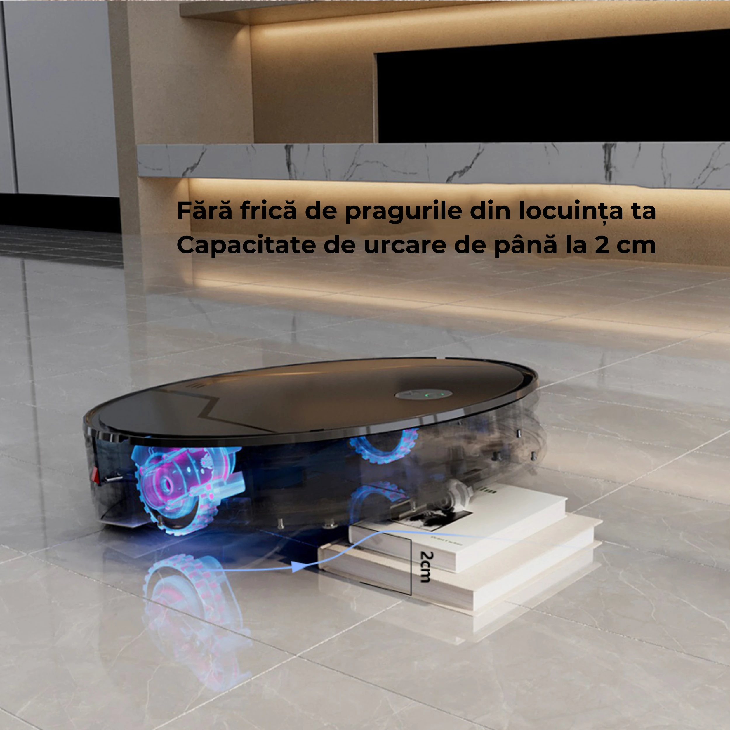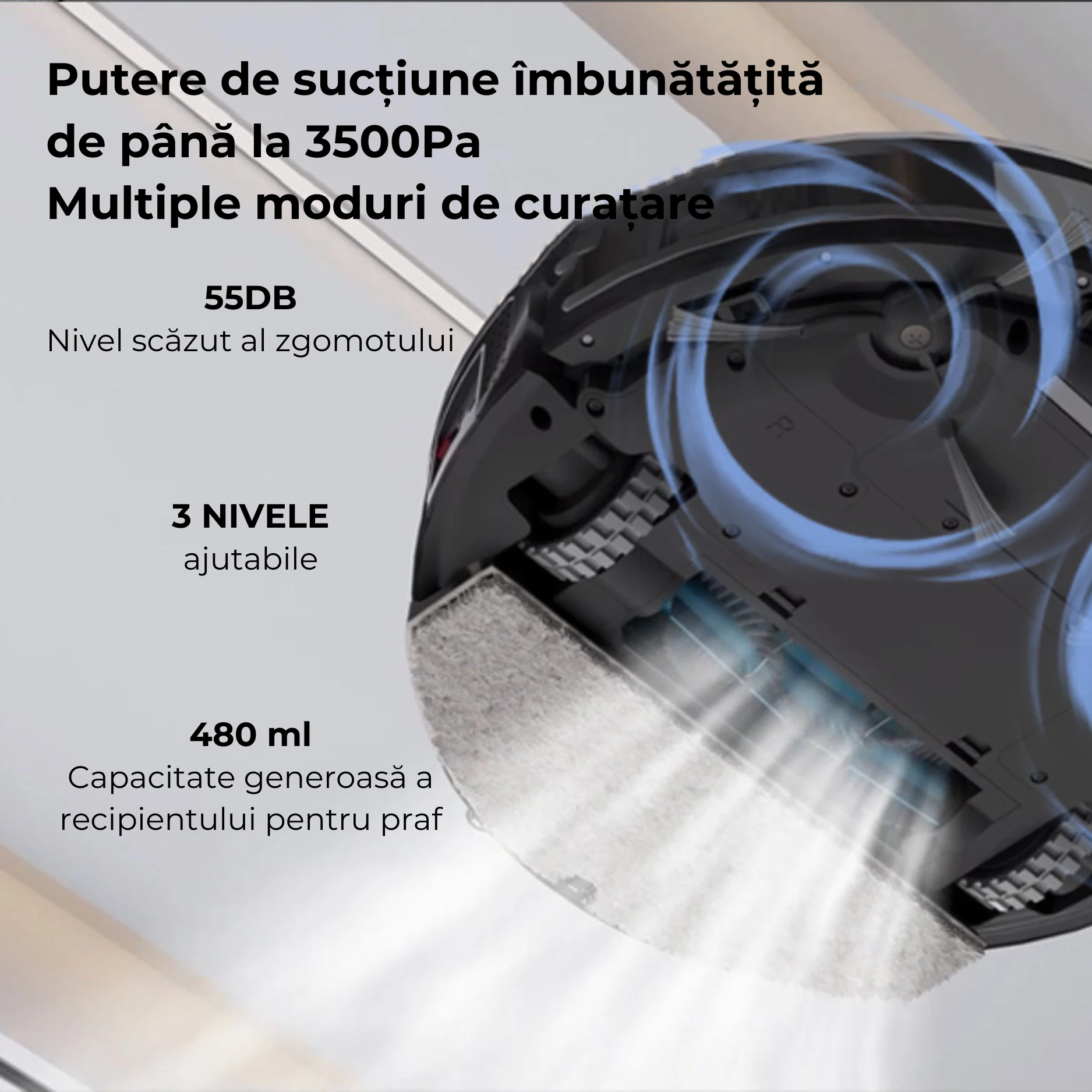 Cu o putere de pana la 3500Pa, acest robot poate face fata chiar si celor mai dificile provocari, cum ar fi parul de animale, resturile alimentare sau murdaria grea. Este perfect pentru familiile cu animale de companie sau pentru locuintele cu copii mici, unde curatenia trebuie sa fie constanta si riguroasa. Puterea de aspirare poate fi ajustata in functie de tipul de suprafata, fie ca este vorba de covoare, parchet sau gresie.